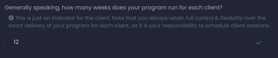 This is where you set the typical program duration in weeks. It's important to give clients an idea of how long your program runs (generally speaking), but ultimately, this is flexible and you have full control over your program delivery.