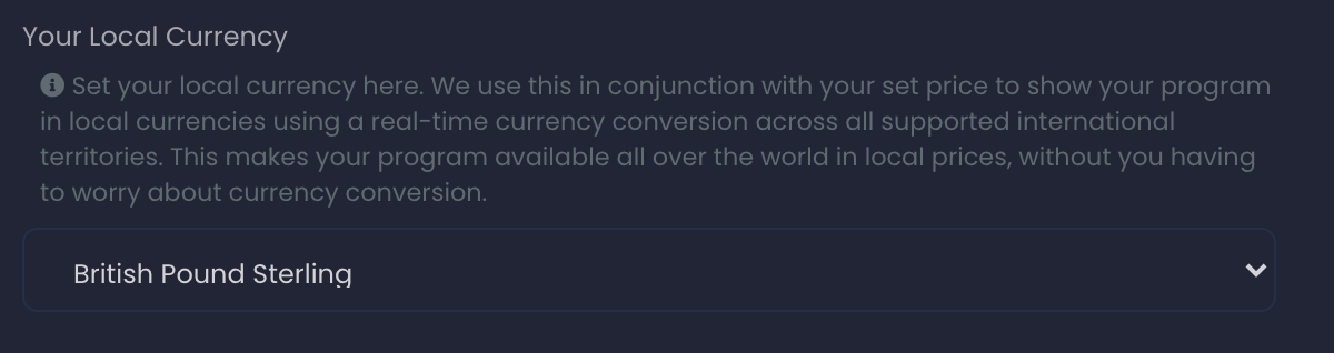 We use this in conjunction with your set price to show your program in local currencies using a real-time currency conversion across all supported international territories. This makes your program available all over the world in local prices, without you having to worry about currency conversion.