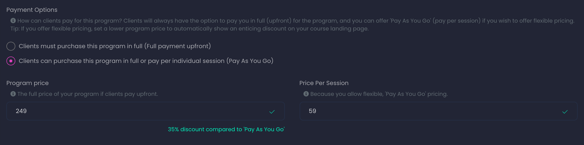 (Pay As You Go) pricing also allows you to offer a discount to clients who purchase the full program. Simply make your per session price higher, or lower your program price to control how big a discount you offer for purchasing in full.